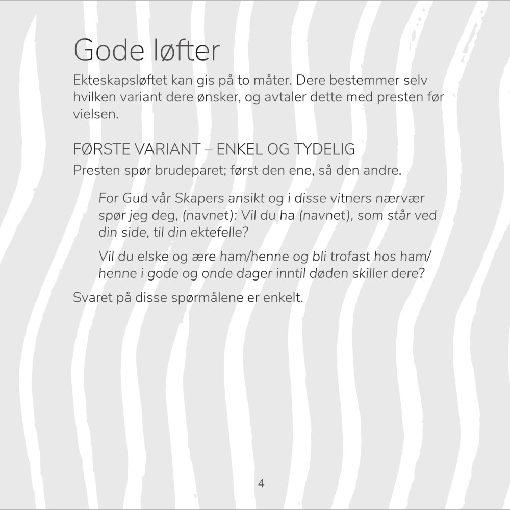 Det viktigste i et bryllup er løftene. Brudeparet må møte opp og være til stede. Det holder ikke å fylle ut et skjema. Når dere sier de magiske ordene, blir dere gift. Slik er det både når vielsen skjer i kirken og på rådhuset.