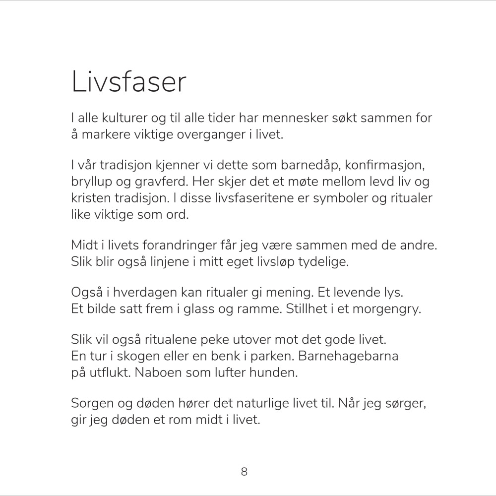 Til alle tider har mennesker søkt sammen for å markere viktige overganger i livet. I vår tradisjon kjenner vi dette som barnedåp, konfirmasjon bryllup og gravferd. Her skjer det et møte mellom levd liv og kristen tradisjon.